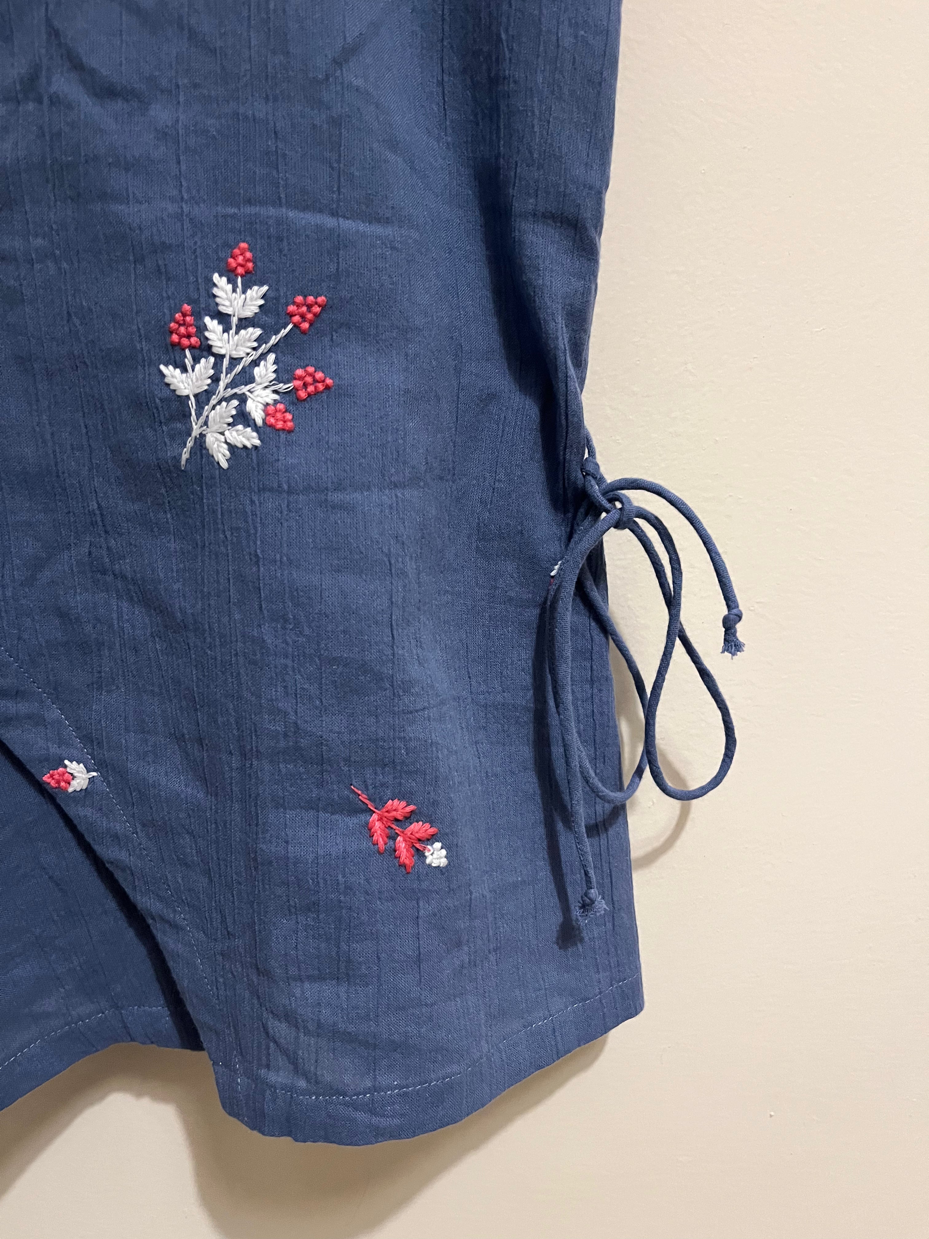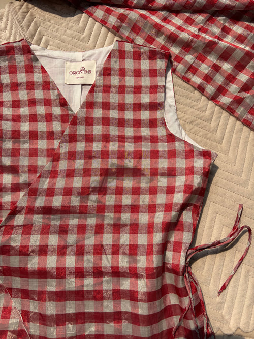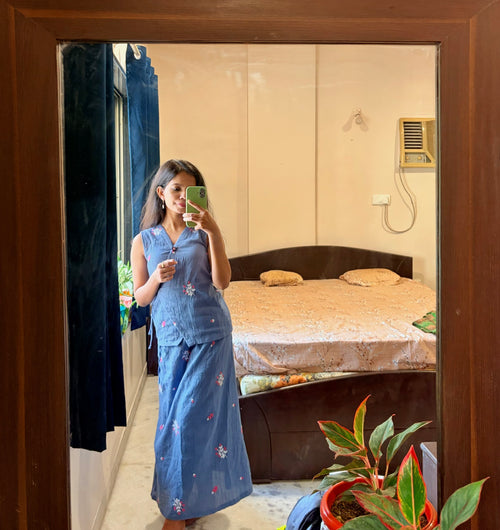 Crafted from Mangalagiri handloom fabric, this co-ord set exudes comfort. The top features a wrap-around vest with tie-up closure, paired with a flared midi skirt with a tie waist.